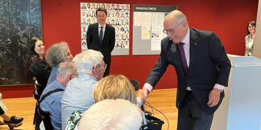 Foto mit Handshake mit Publikum: In der vordersten Reihe sassen drei Bewohnende der Residenz Multengut, welche an diesem Tag ihren Geburtstag feierten. Herr Ogi gratulierte allen persönlich.