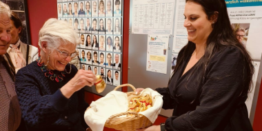 Foto mit Korb: Die Gäste erhielten von Selina Romano, Leiterin Administration & HR, im Nachgang zum Referat einen kleinen Gold-Osterhasen.