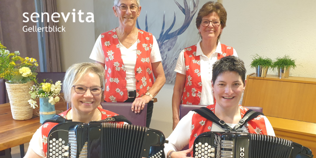 - 20. November 2025, 14:15 Uhr bis 15:15 UhrGellertblick, Basel«Akkordeon-Konzert» mit der Formation Dal BoscoTraditionelle Schweizer Melodien hüpfen durch den Raum, wenn die «Akkordeon-Formation Dal Bosco» aufspielt. Wir freuen uns sehr, dass die Damen Doris, Ursula, Ursi und Irène ihre wunderbaren Instrumente ins Auto laden, um uns ein «lupfiges» Konzert zu präsentieren. Schön, wenn auch Sie dabei sind und mit uns in gemütlicher Runde am Nachmittag sympathische Musik geniessen.